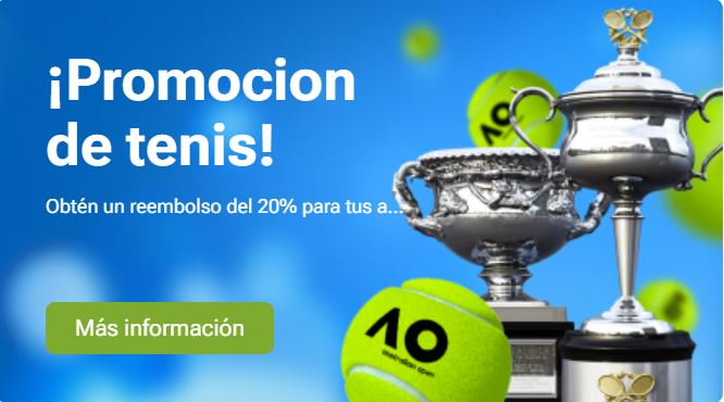 La casa de apuestas 1XBET tiene una promoción en la que recibe un reembolso del 20% hasta un máximo de 100€ en tus apuestas de tenis.