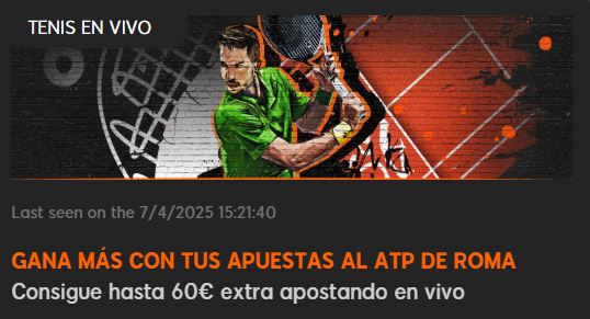 - Tipo de apuestas: Solo cuentan apuestas simples en vivo al ATP Roma con cuota mínima de 2.00.