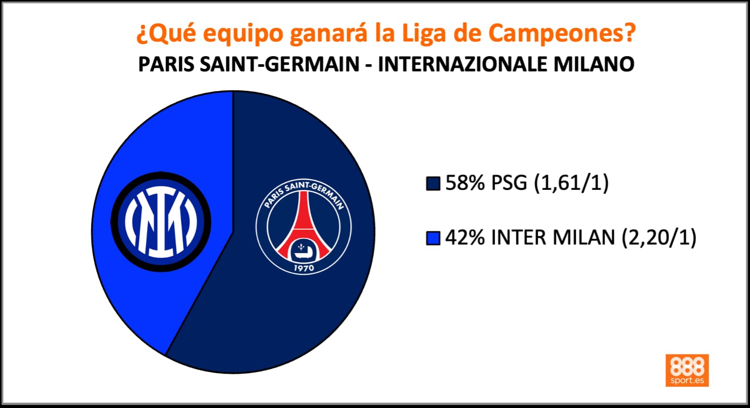 La Final de la UEFA Champions League 2025 ya calienta motores, y según los últimos datos de 888Sport, el PSG parte como favorito entre sus usuarios. Un 58% de los apostantes confía en el equipo francés para imponerse al Inter de Milán, que recibe el respaldo del 42% restante. El gran duelo europeo se disputará el sábado 31 de mayo de 2025 a las 21:00h, prometiendo máxima emoción y excelentes oportunidades para apostar.