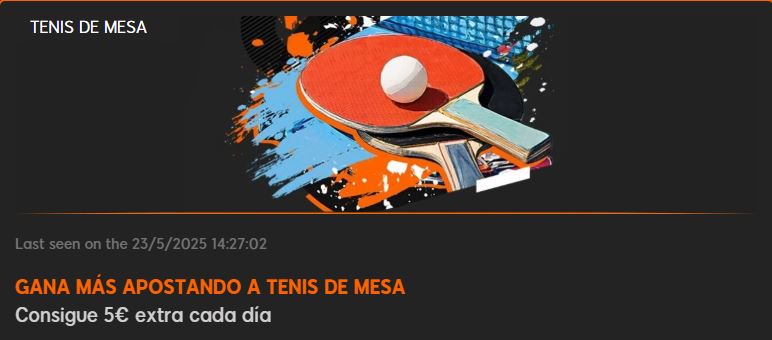 - Tipo de Apuesta: Apuestas a tenis de mesa con cuota 2.0 o superior, realizadas y resueltas en un mismo día natural.