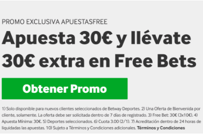 - Bono Betway: bienvenida de 200€ de apuesta segura o Promoción exclusiva para ApuestasFree de Black Friday muy interesante: apuestas 30€ a cuota 3.00 o superior y te regalan 30€ en freebets.