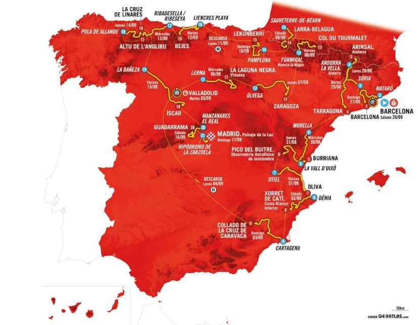La primera etapa será contrarreloj por equipos y tendrá lugar en Barcelona (14.8km). La última se realizará desde el Hipódromo de la Zarzuela hasta Madrid (101,1km). Entre el inicio y el final habrá dos días de descanso (4 septiembre y 11 de septiembre). En cuanto a las etapas, se vivirán 8 de montaña, 4 de media montaña, 3 escarpadas, 4 llanas y 2 contrarreloj (una por equipos y otra individual).