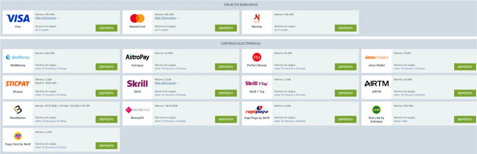 - Carteras electrónicas: WebMoney, AstroPay, PerfectMoney, MuchBetter, Jeton Wallet, Sticpay, Skrill, AIRTM y MoneyGo.