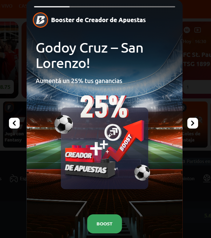 Activá el ”Boost” que propone la Casa Betano, armá tu boleto bajo la opción “Creador de Apuesta” y ganá el 25% extra en las ganancias de apuesta para el duelo entre Godoy Cruz y San Lorenzo. ¡Premio por tu pasión por el fútbol como te lo mereces en Betano!