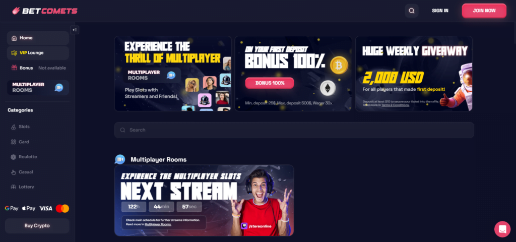 Como has podido observar, no hemos hablado en ningún momento sobre lo que tendrás la posibilidad de acceder dentro de este sitio. Pero si te mencionamos que Betcomets posee un bono para apuestas deportivas, del cual te contaremos más adelante. Pero aquí, te explicaremos todo lo que hallarás dentro de esta grandiosa página.
