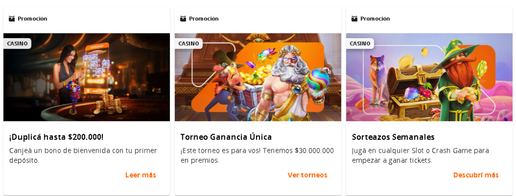 La oferta consiste en una bonificación del 100% sobre tu primer depósito en el sitio. Es decir, el doble del monto que hayas depositado te será acreditado instantáneamente. Pero ojo, que tiene un tope máximo de $350.000 como límite. Por lo tanto, tenlo en cuenta a la hora de ingresar tu dinero. Además, si bien este es el monto para utilizar en tus juegos elegidos, el bono también incluye 200 giros gratis en tragamonedas