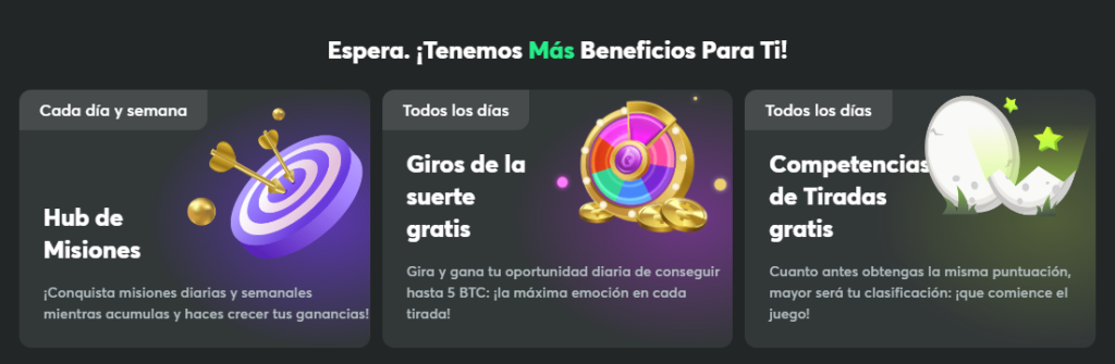 Otras promociones especiales de BCGame para Argentina además del bono para casino son las ofertas para eventos deportivos importantes o para juegos exclusivos. Este tipo de ofertas incluyen principalmente apuestas gratuitas y giros gratis. Pero también existe la Rueda de la Suerte por premios en metálico.