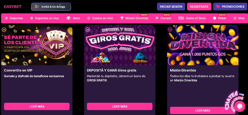 Por supuesto que hay muchas otras ofertas de EasyBet en Argentina, como más promociones de Giros Gratis, un Club VIP con beneficios exclusivos, torneos gratuitos diarios y más. De nuestra parte, te invitamos a descubrir si EasyBet ofrece un Bono de Apuestas Deportivas.