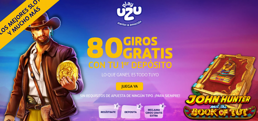 El bono para slots de Playuzu consiste en 50 giros gratis en la tragamonedas “John Hunter & The Book of Tut”. Además, podrás reclamar 30 giros gratis extra en la sección “sorpresas” de Playuzu.