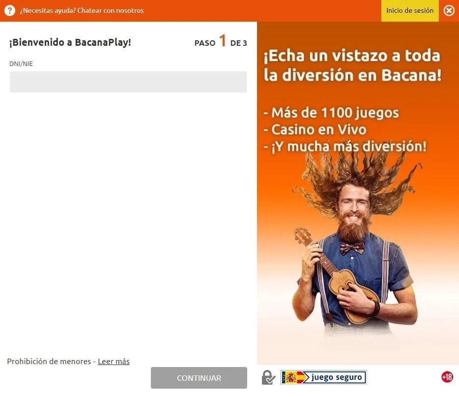- El formulario de registro se compone en 3 pasos. En el primero, tendrás que escribir tu DNI con letra (mayúscula y sin guión ni espacio). El segundo paso es el que pide introducir los datos personales (Nombre, apellidos, nacionalidad…). Conforme vayas introduciendo tus datos, verás que BacanaPlay también solicita tus datos de contacto (lugar de residencia, teléfono) y de cuenta (nombre de usuario y contraseña).