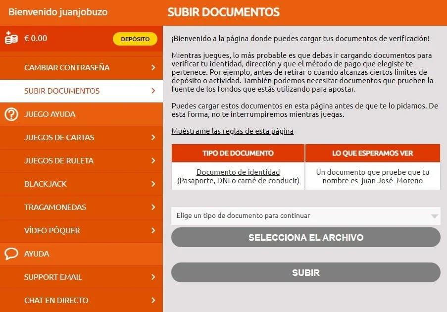 - Dentro del menú de tu cuenta, verás una pestaña en la que se puede leer «subir documentos». Pincha en ella y recuerda tener tu Documento Nacional de Identidad.