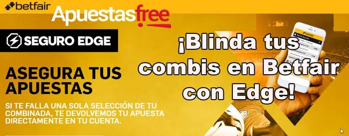 Gracias al Seguro Edge de Betfair, ya podemos asegurar nuestras apuestas múltiples: si fallamos una selección en nuestra combinada, nos la devuelven directamente el importe de nuestra apuesta en la cuenta. Este seguro está disponible para todas las combinadas de tres o más pronósticos, en todos los deportes y mercados, incluso en las apuestas en directo o live.