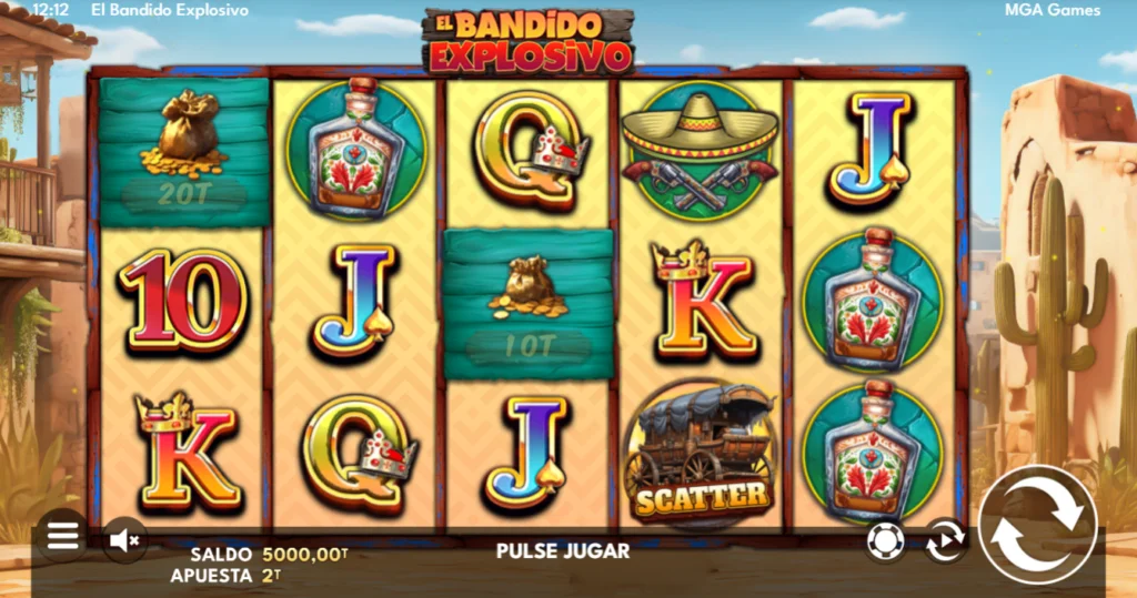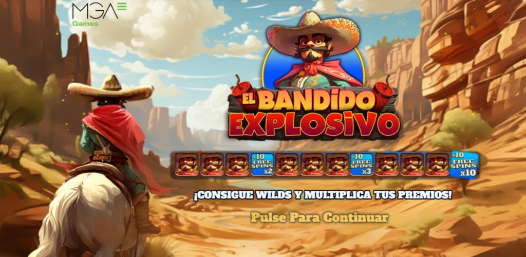 Bandido explosivo es una videoslot de MGA en la que encarnarás la piel de un peligroso forajido mexicano que intenta hacerse constantemente con los grandes botines del Salvaje Oeste colocando explosivos en lugares estratégicos mientras giras sus 5 rodillos de 3 filas.