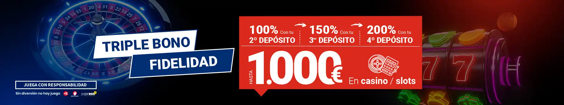 2º depósito: Bonificación del 100% hasta 1.000€. Con este bono, obtendrás una cantidad de saldo de casino igual a la cantidad depositada. Ingresas 1.000€ y te regalan 1.000€ extra