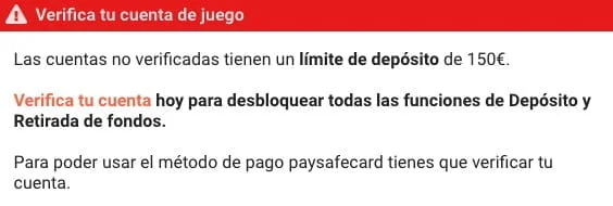 Esta pantalla te aparecerá cuando inicies sesión para ayudarte a verificar tu cuenta. Una vez lo hayas hecho, como te decíamos anteriormente, podrás disfrutar de más ventajas como, por ejemplo, poder retirar los fondos de tu cuenta de juego. Además, podrás realizar depósitos de más de 150€.