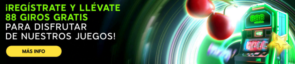 El bono sin depósito de 888Casino es una promoción que ofrece 88 giros gratis para jugar en las slots del casino, simplemente por registrarte, sin necesidad de hacer un depósito.