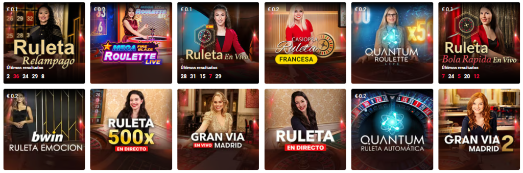 Una de las secciones imprescindibles en un buen casino online, y en este caso, la de bwin es una de las más completas al contar con 22 juegos en su catálogo. En ella, verás disponibles ruletas en vivo, cuyas partidas se retransmiten en directo desde un casino real y son dirigidas por crupieres de carne y hueso. ¿Lo mejor de todo? Que la mayoría de ellas se encuentran disponibles las 24 horas del día.