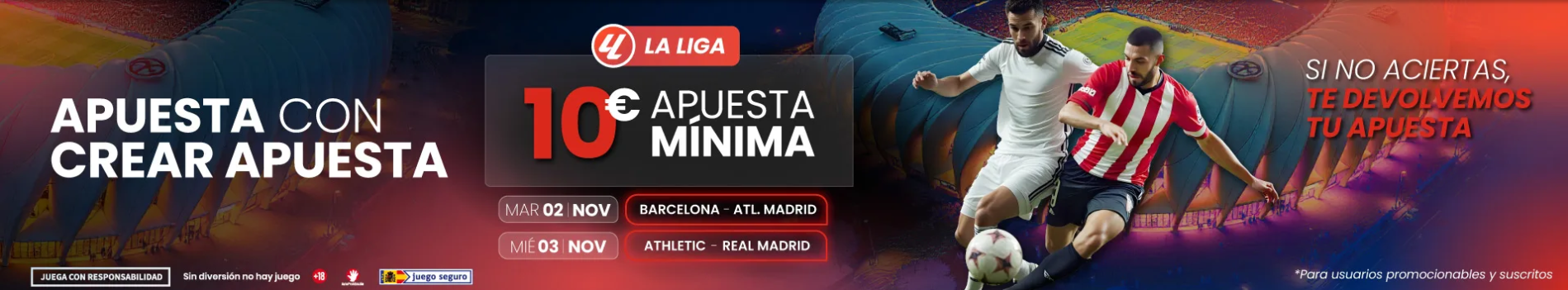 La mecánica es directa y está diseñada para que las apuestas de esta semana tengan un extra de seguridad. Para participar solo necesitas realizar una apuesta simple de 10€ o más, usando saldo real y la función Crear Apuesta, a cuota mínima de 3.00 en cualquiera de los dos partidos promocionados de La Liga.