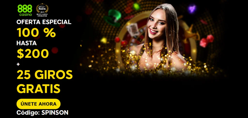La primera de ellas, es un Bono de Bienvenida que bonificará en un 100% el primer depósito que realicemos hasta un máximo de $200. Y eso no es todo: Además de eso la casa nos otorgará 25 giros gratuitos para aprovechar en las 888Casino mejores tragamonedas. Para obtener esta promoción debemos usar el Código Promocional “Spinson”