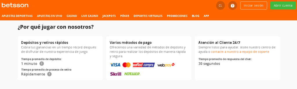 A diferencia de muchos otros sitios, Betsson demuestra su superioridad al brindar un servicio de calidad integral. Estamos haciendo referencia, a que no solo ofrece los mejores juegos, cuotas y eventos del mercado. Sino, también, que dispone de un chat de atención al cliente que funciona las 24 horas los 7 días de la semana. Además, serás atendido por un representante que podrá aclarar tus inquietudes, y no por un contestador automático que responde de manera predeterminada. Por todos estos motivos, si estás empezando tu aventura de juego, no dejes de probar a la casa más elegida por los chilenos. ¡Únete ahora!