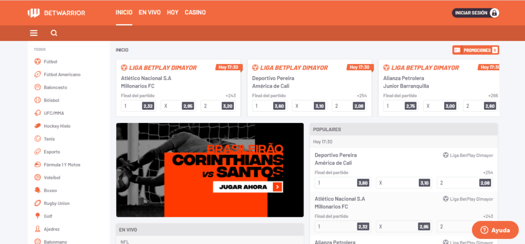 Betwarrior es, antes que nada, una verdadera casa de apuestas deportivas, y es por eso que la sección de Deportes se convierte en su apartado principal. Puedes apostar en todos los eventos que te imagines y te interesen, desde nacionales hasta torneos y campeonatos mundiales, europeos y más. Quizás su disciplina más popular y recomendada sea el fútbol, con todas las ligas y copas que se te ocurran para realizar tus pronósticos. Pero también podrás encontrar los eventos más importantes del mundo en tenis, baloncesto, rugby, boxeo, voley y muchísimos más.