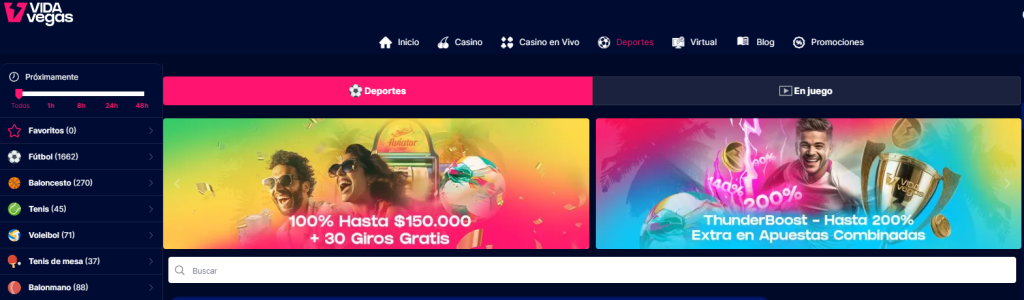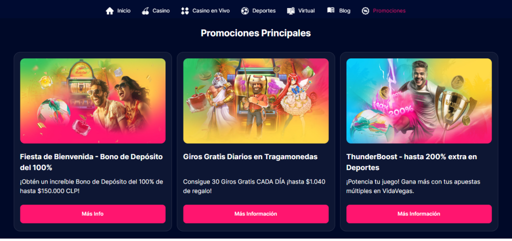Además del Bono de Bienvenida, VidaVegas cuenta con otras promociones para jugadores amantes de las apuestas deportivas. Entre los más destacados está el ThunderBoost, que otorga hasta un 200% extra en ganancias de apuestas combinadas. También hay bonos exclusivos para casino y casino en vivo, como giros gratis en juegos populares, cashbacks o beneficios por recargar tu saldo. Cada bono tiene condiciones específicas que vale la pena revisar antes de activar.