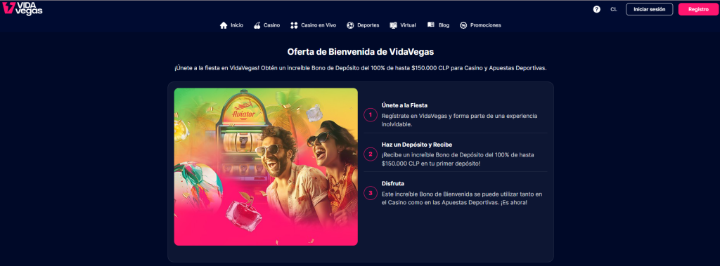 El Bono de Bienvenida de VidaVegas Chile ofrece a los nuevos usuarios un porcentaje extra de bono, ¡que aplica al casino y a las apuestas deportivas según lo que tú elijas! Más específicamente, un 100% extra en su primer depósito hasta $150.000 CLP, para los deportes que nos interesan hoy. Este bono te permite duplicar el monto inicial y apostar en una amplia variedad de eventos. Pero por supuesto, es necesario que cumplas con todos los requisitos que vamos a detallar a lo largo de este artículo.