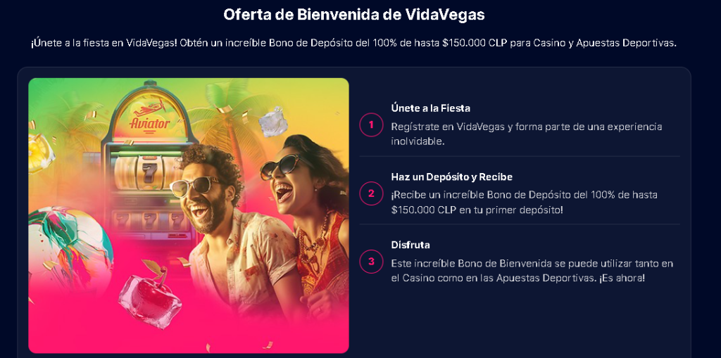 El Bono de Bienvenida de VidaVegas consiste en el 100% extra del primer depósito hasta un máximo de $150.000 CLP. Puedes usar los fondos en juegos de casino, casino en vivo y también apuestas deportivas. Una oferta para disfrutar en los juegos que quieras, menos ruletas y blackjack.