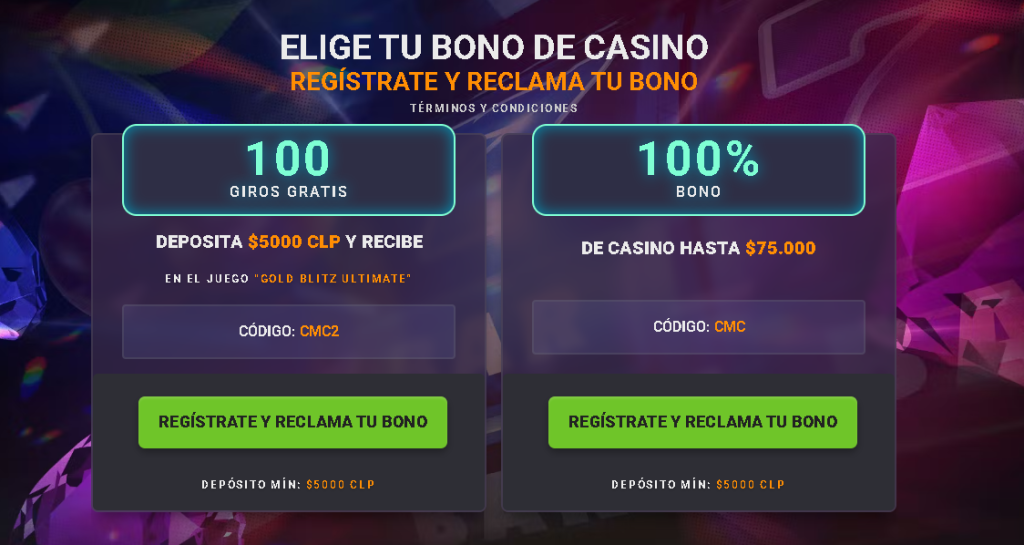 Cada cliente que escoja el Bono de Casino debe optar por una de las dos posibilidades. La primera opción consiste en una bonificación del 100% sobre tu saldo del primer depósito, con un tope de $150.000 CLP. Para ello, es requisito depositar, por lo menos, $5.000 CLP e introducir el código promocional CWCL2.