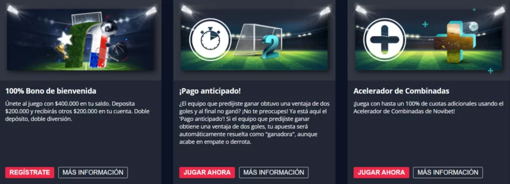 Entre las promociones de Novibet encontramos bonos de depósito, apuestas gratis para tus eventos favoritos y tiradas gratuitas para las tragamonedas más populares del sitio. Aprovecha también herramientas y servicios de altísima calidad, súper útiles para desarrollar tu juego y tus apuestas de una manera limpia y responsable.