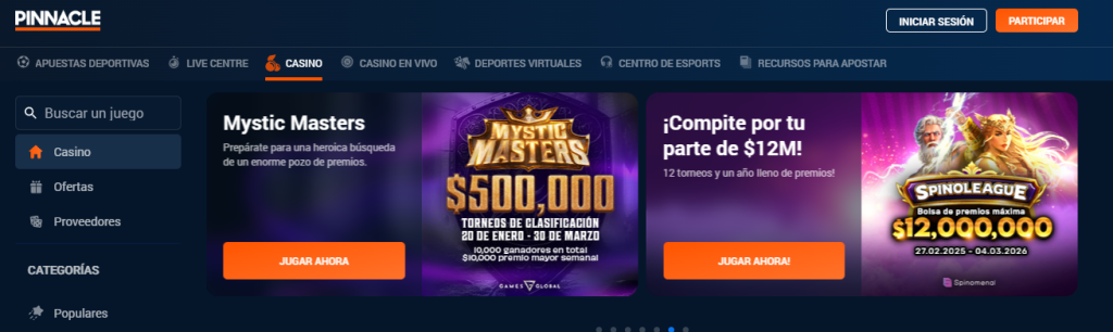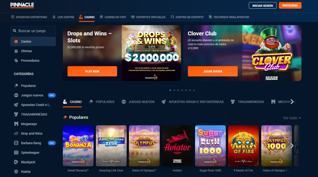 Pinnacle cuenta con un extenso catálogo de tragamonedas de distintos proveedores, con cientos de opciones que incluyen títulos clásicos, slots con jackpot progresivo y juegos con mecánicas innovadoras. La plataforma actualiza constantemente su oferta para incluir los últimos lanzamientos y garantizar a los jugadores una experiencia variada y emocionante. Siempre encontrarás nuevas opciones para explorar y disfrutar.
