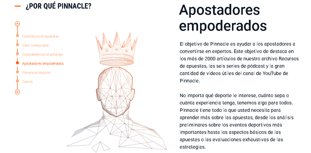 Siguiendo esa línea, Pinnacle cuenta con más de 2.000 artículos en su archivo Recursos de Apuesta, seis series de pódcast y una gran cantidad de videos útiles en su canal de YouTube. Tanto para los apostadores nuevos como para aquellos más expertos, hay material se gran valía. Desde los análisis preliminares de los eventos deportivos más populares a nivel Mundial hasta los aspectos básicos de las apuestas. La casa busca formarte y, de esta manera, empoderarte.