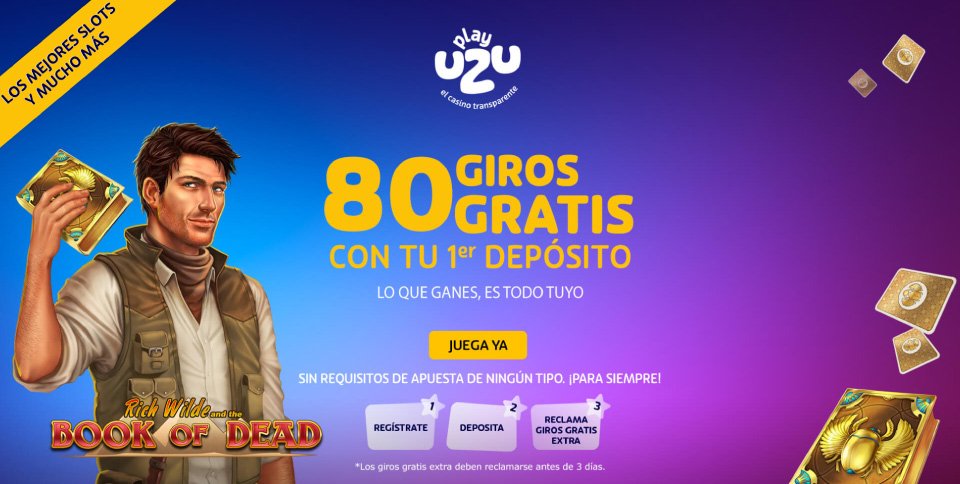 Lo cierto es que Playuzu no tiene un bono sin depósito propiamente dicho. Sin embargo, cuenta con una oferta exclusiva para nuevos usuarios de 80 Giros Gratis al depositar para jugar a las mejores slots. ¡Regístrate y obtén las Jugadas Gratuitas!