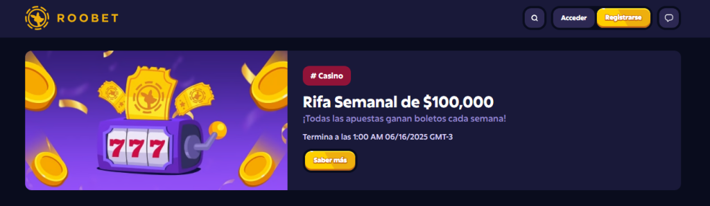 Otro gran atractivo de Roobet es su participación en las Rifas Semanales de $100K+, donde los jugadores tienen la oportunidad de ganar premios en efectivo simplemente por haber jugado en la plataforma durante la semana.