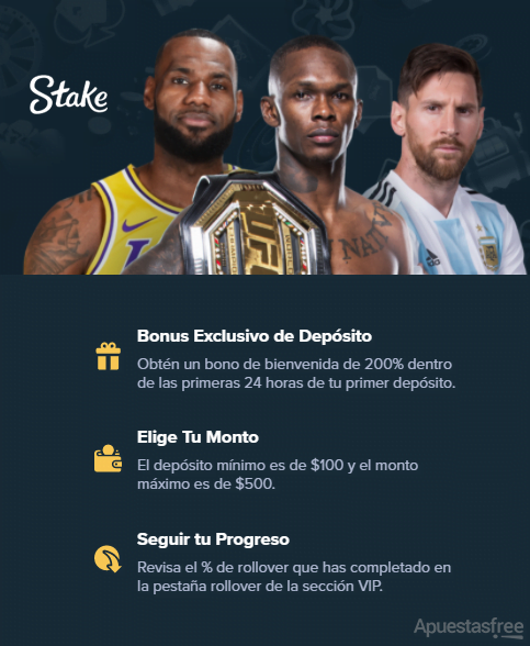 Es una Promoción exclusiva para los nuevos clientes de Chile que registran su cuenta por primera vez en el sitio. Obtén un 200% extra respecto a tu depósito inicial, con un tope máximo de Bono de Bienvenida de hasta US$ 400 en Stake.