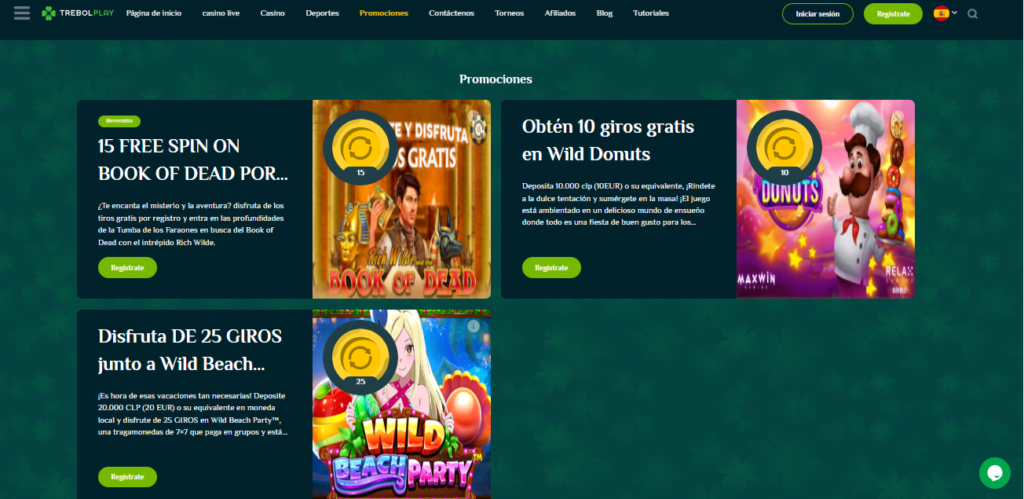En el caso del bono para casino de Trebolplay, es una bonificación de bienvenida. La misma te dará la posibilidad de acceder a 15 giros sumamente gratis. De esta manera podrás obtener unos primeros ingresos, sumamente necesarios para el ambiente de los juegos en línea. Estos free spin, podrán ser utilizados dentro del slot “Rich Wild and the Book of Dead”.