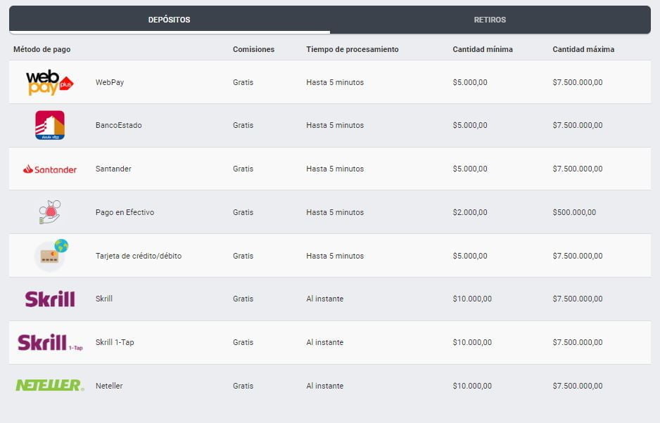 Los depósitos con WebPay se procesan casi al instante y no tendrás ningún gasto extra por comisión. En no más de 5 minutos los fondos estarán disponibles en tu cuenta para que puedas empezar a apostar en eventos de todo el mundo o disfrutar de los mejores juegos de casino en línea. ¡Aprovecha esta oportunidad!