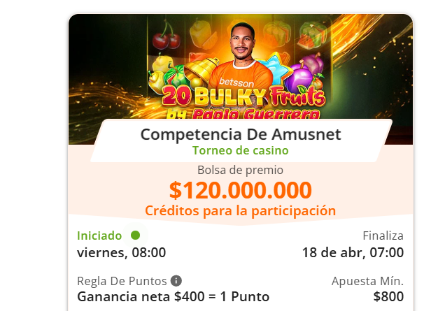 Si este beneficio te ha motivado para ser parte de la comunidad Betsson, el Bono de Bienvenida te hará lanzarte de cabeza a ello. Porque Betsson propone entregar hasta $1.000.000 para los Juegos de Casino + 50% de reembolso en juegos crash, dinero de bonificación totalmente válido para participar también del Torneo Competencia Grande de Amusnet del otoño en el sitio.