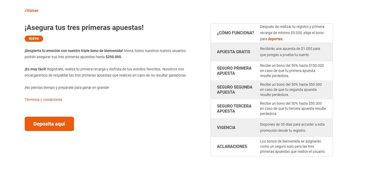 Por tu primer depósito, de al menos $5.000 COP, recibirás una bonificación del 100% hasta $250.000 COP. Y podrás utilizarlo en cualquier apuesta simple o combinada, con cuotas mínimas de 2,5.