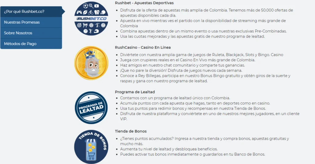 Continuando con lo que nos ofrece Rushbet Colombia, como productos, tenemos: Sección deportiva y sección de Casino en Línea. En su sección de Casino podemos encontrar algunos de los mejores tragamonedas desarrollados por Empresas con trayectoria como: Slingo, Greentube, Pragmatic, IGT, AGS, Habanero, NetEnt, EVERi, Boongo.