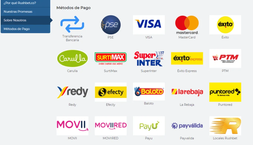 Tienes a disposición: Débito bancario PSE, Tarjetas de crédito y débito VISA y Mastercard, Grupo Éxito, VÍA baloto, Efecty, Locales Rushbet, la app móvil y Puntos MoviiRed.