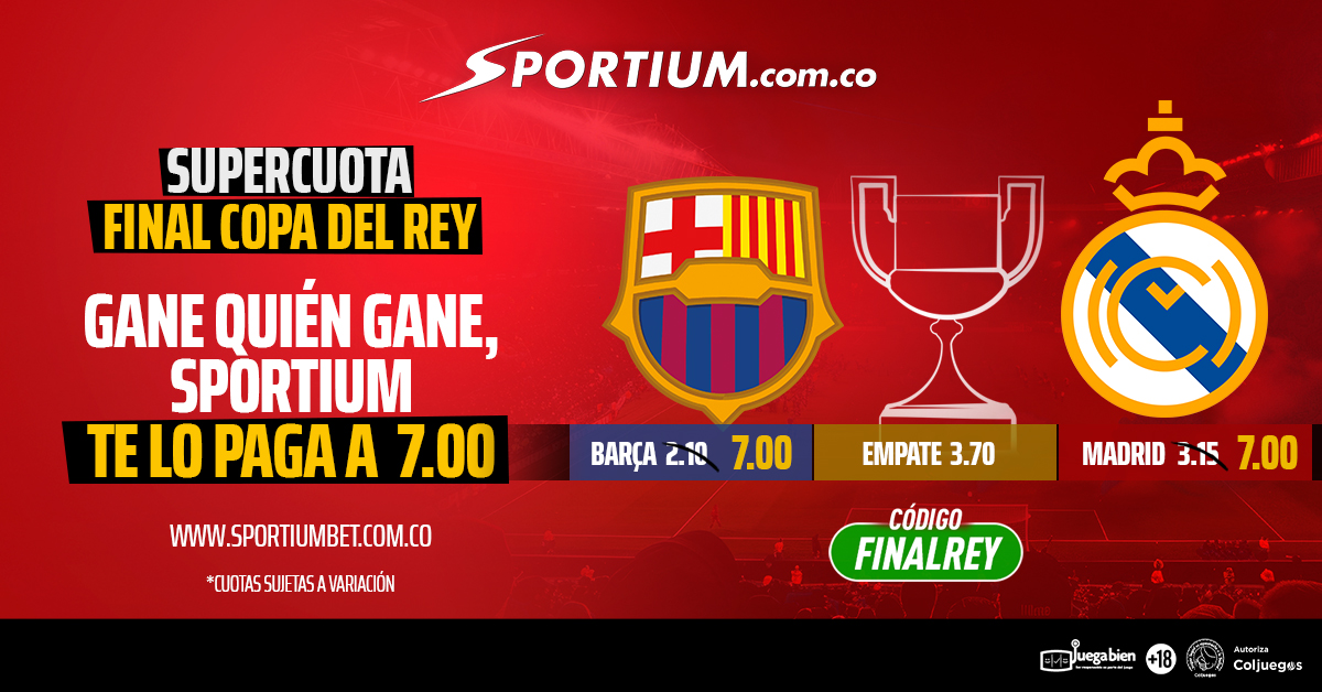 Estamos en la cuenta regresiva a la final de la Copa del Rey entre Barcelona y Real Madrid y Sportium lanzó una Supercuota imperdible para los apostadores de Colombia. Una gran oportunidad en uno de los partidos más importantes del año. ¡Apuesta con una cuota de 7.00!