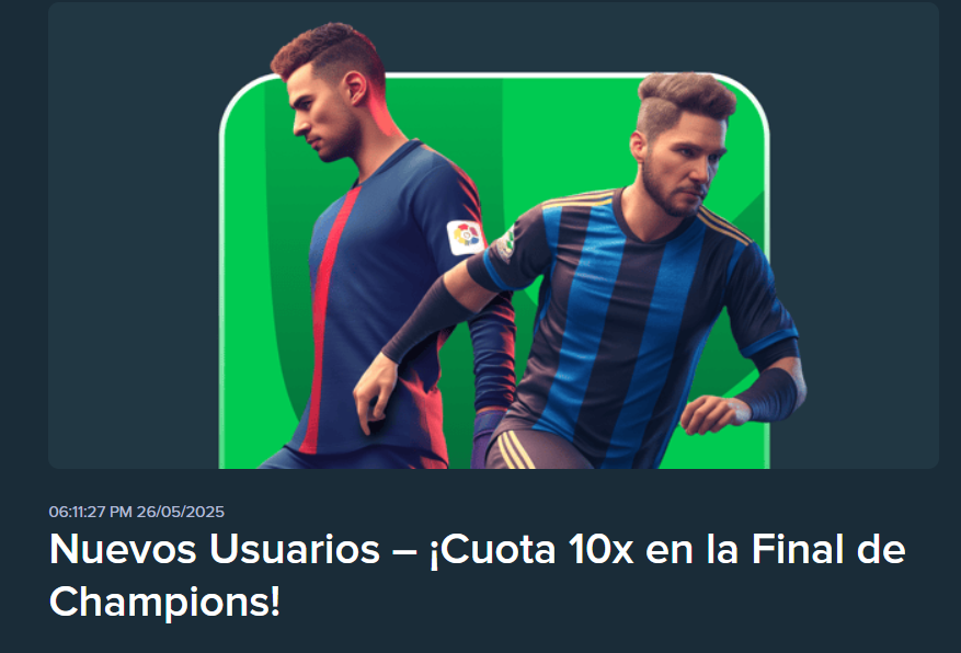 En el día de la fecha te presentamos la Promoción “Bono de Cuota 10x para la Final de la Champions League” en Stake. Una Oferta que estará vigente durante la gran final europea por excelencia para usuarios de Colombia y que entrega un beneficio exclusivo para los aficionados al deporte de la pelota, ideal para disfrutar de una experiencia única.