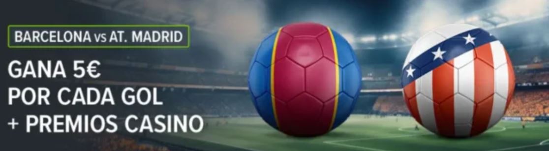 La casa de apuestas Codere ofrece una promoción para el partido Barcelona vs Atlético en la que gana 5€ por cada gol anotado + Premios de Casino. Encuentro correspondiente a la Copa del Rey. Además, aprovecha el bono de bienvenida de hasta 200€.