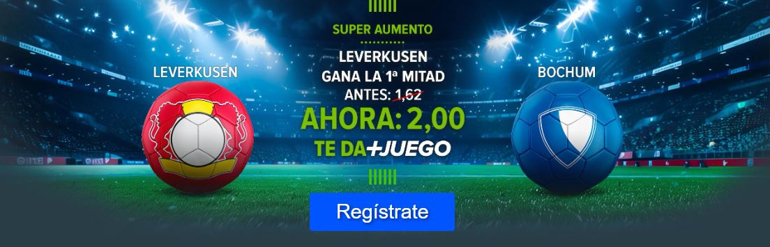Codere lanza una promoción exclusiva para el emocionante partido entre Bayer Leverkusen y Bochum, correspondiente a la jornada 27 de la Bundesliga. Si apuestas a que el Leverkusen gana la primera mitad, podrás hacerlo con una cuota mejorada de 2.00 gracias al Super Aumento disponible solo por tiempo limitado. Además, si aún no tienes cuenta, puedes reclamar el bono de bienvenida de hasta 200€ para comenzar a apostar con ventaja.