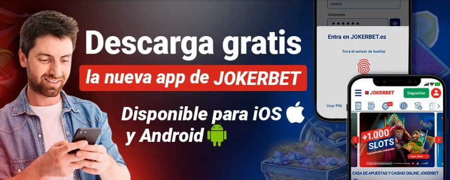 Para descargarla, solamente deberás acceder a la web oficial de JOKERBET y pulsar en el ‘banner’ que te aparece en la parte superior que dice ‘Descarga App para Android e iOS’. Te llevará automáticamente al Google Play o App Store y desde ahí lo tendrás todo listo para jugar tanto a casino como a apuestas deportivas a solo un clic.