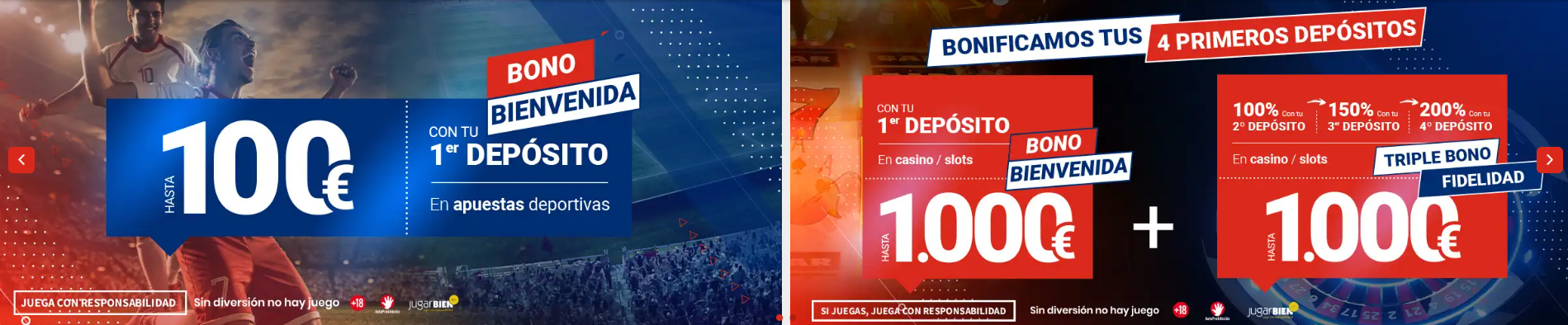 JOKERBET cuenta con dos bonos de bienvenida para sus nuevos clientes que tienes que aprovechar sí o sí. Su bono de apuestas es del 100%, hasta un máximo de 100€ y el de casino, de hasta 1.000€ con el primer depósito y una bonificación del 100%.