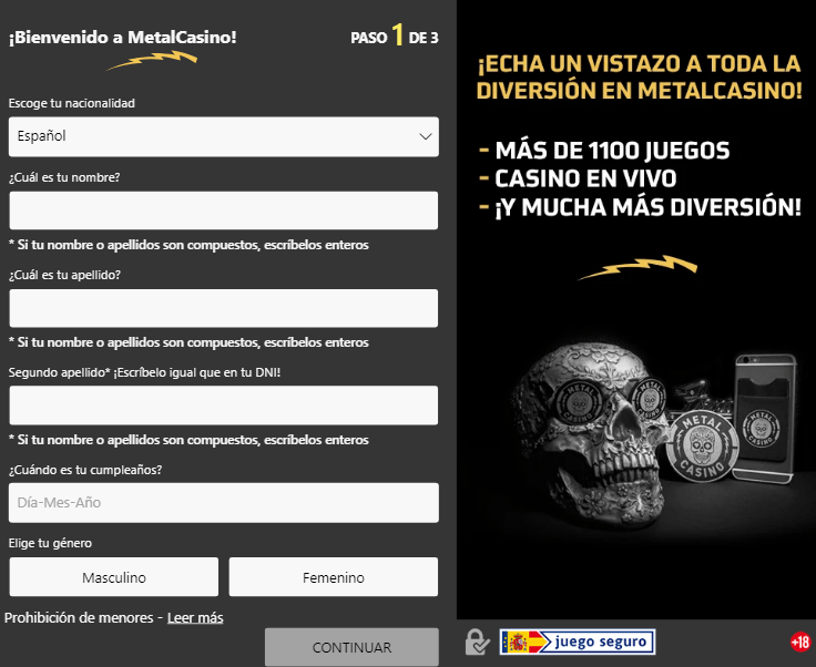 La legislación española establece que solo podrás crear una cuenta en Metal Casino en el caso de que tengas 18 años o más.
