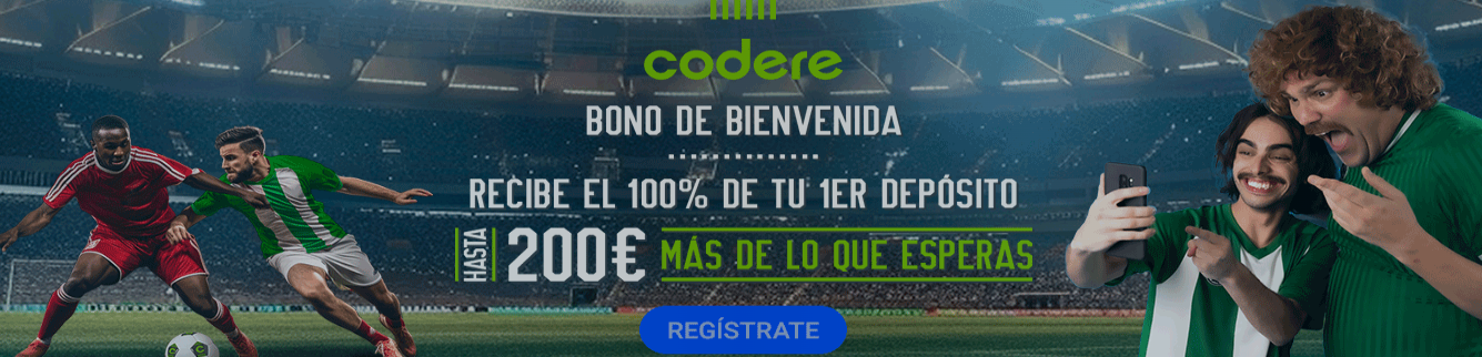 Codere es una de las casas de apuestas favoritas de nuestros usuarios y una de las más completas a la hora de apostar a cualquier deporte. Además, cuenta con una plataforma de streaming, una App totalmente funcional, una sección de cuotas mejoradas y especiales y mucho más.