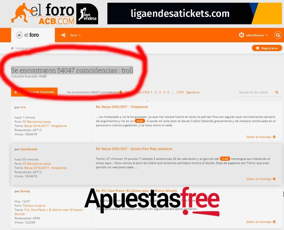El foro de la ACB alcanza ya los casi 29 ¡millones! de mensajes, con más de 400.000 mil temas y casi 157 mil usuarios totales. Unas cifras tan elevadas que se entiende que en un espacio así haya de todo: aficionados que buscan comentar y aprender más sobre su deporte favorito, y gente que se cree en posesión de la verdad, que entiende de basket más que nadie sobre la faz de la tierra y que, además, es maleducada, faltona y hasta violenta, que sólo busca con quien engancharse.